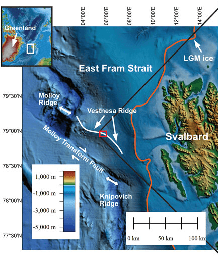 Vestnesahryggur. Mynd úr þessari grein: Cooke F, Plaza-Faverola A, Bünz S, Sultan N, Ramachandran H, Bedle H, Patton H, Singhroha S and Knies J (2023), Sedimentary deformation relating to episodic seepage in the last 1.2 million years: a multi-scale seismic study from the Vestnesa Ridge, eastern Fram Strait. Front. Earth Sci. 11:1188737.